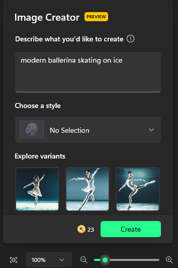 You can see in the upper left the option to describe what you would like to create. This is a pretty simple line to help guide the creation process. So lets try entering modern ballerina skating on ice.