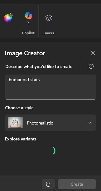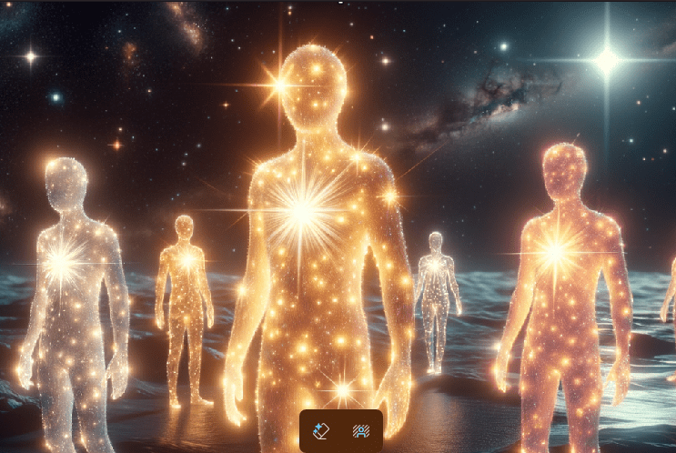 If you were tasked to describe the image above in a sentence, what would it be – this is the reverse engineering process of trying to describe the image for it to create. Not sure if that makes sense, but to create something, you have to enter descriptive terms, then show the image to your friend and see if they can describe what the image is. If they answered correctly, then the ai image creator did its job, but there are so many abstract references within the art it is hard to describe. I believe the above image is man playing poker with aliens, or something like that, but how many people will have guessed it – it is like a form of pictionary – so now lets try the image creator and enter humanoid stars and see what we get.